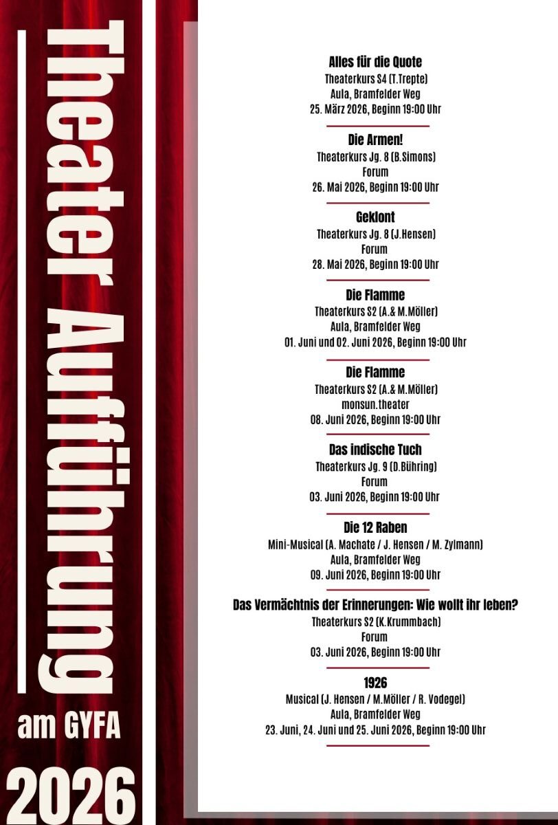 Vorhang auf: Theaterprogramm 2026 Apr. 24, 2026 | Allgemein, Theater Schauspiele und Theater haben eine lange Tradition bei uns an der Schule, und auch in dieser Saison wartet eine ganze Reihe von großartigen Aufführungen auf das Publikum. Viel Spaß damit!
